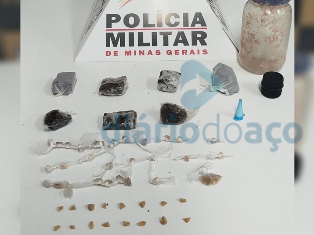 Ao verificar o objeto arremessado ao chão, os policiais localizaram uma porção de maconha, embalada e pronta para a comercialização, 16 pedras de crack, acondicionadas em um pequeno tubo plástico, e um pino contendo cocaína.
