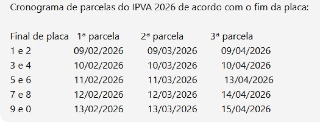 O cronograma de parcelas do IPVA 2026 varia de acordo com o final da placa do veículo. Para placas com finais 1 e 2, a primeira parcela vence em 9 de fevereiro, a segunda em 9 de março e a terceira em 9 de abril. Veículos com placas de finais 3 e 4 têm vencimentos em 10 de fevereiro, 10 de março e 10 de abril. Já os finais 5 e 6 devem pagar em 11 de fevereiro, 11 de março e 13 de abril.No caso das placas com finais 7 e 8, as datas são 12 de fevereiro, 12 de março e 14 de abril. Por fim, para veículos com placas de finais 9 e 0, os vencimentos ocorrem em 13 de fevereiro, 13 de março e 15 de abril de 2026. O pagamento fora do prazo implica incidência de multa e juros, conforme a legislação vigente.