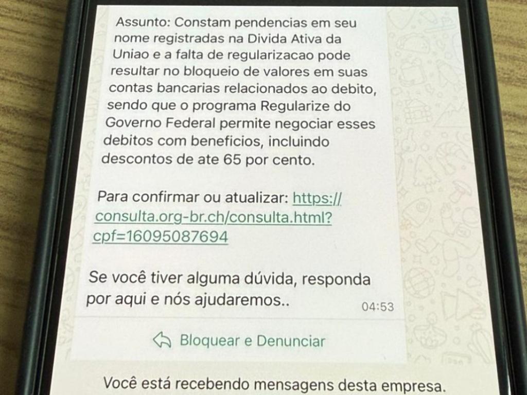 O relato foi feito pela vítima, ao jornal Diário do Aço. Na mensagem enviada pelos criminosos à mulher é alegado que constam pendências no nome da ipatinguense, registradas na dívida ativa da União, e que a falta de regularização pode resultar no bloqueio de valores em contas bancárias relacionadas ao débito.