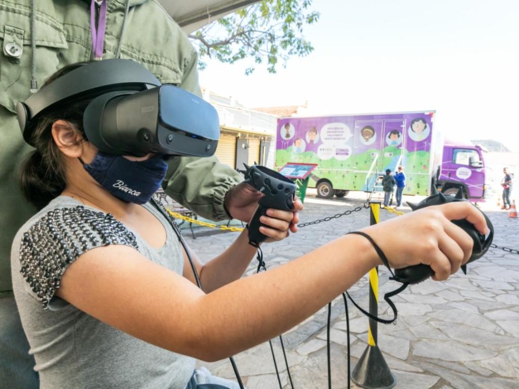 Além do jogo no interior do caminhão, que é totalmente acessível para atender a pessoas com deficiência, a estrutura conta com uma tenda tecnológica, onde são realizados diferentes jogos, com destaque para o de realidade virtual.