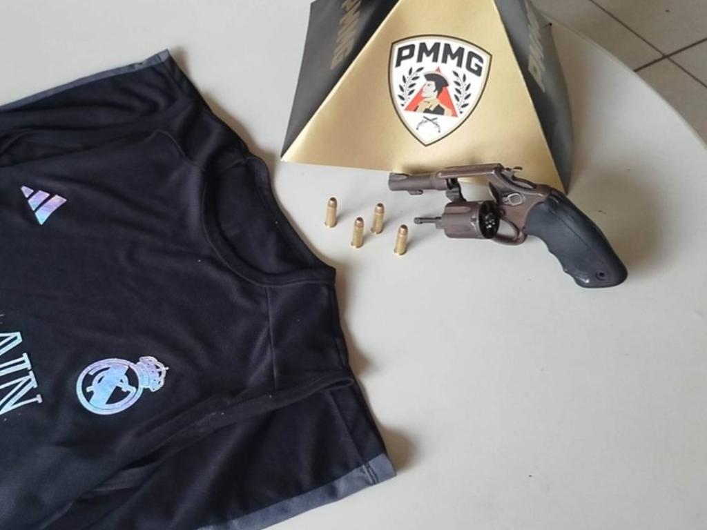 A arma de fogo, as munições e a camiseta preta foram recolhidas e entregues na Delegacia de Polícia Civil. J.S.N. foi conduzido e passa a responder por porte ilegal de arma de fogo.