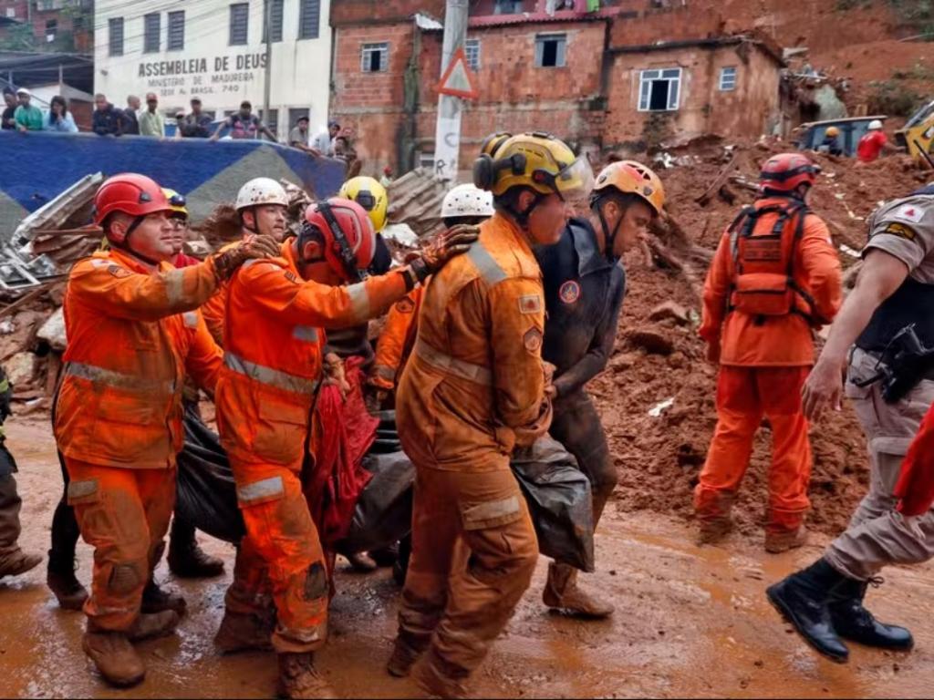 Bombeiros transportam um dos 42 corpos de vítimas da chuva em Juiz de Fora