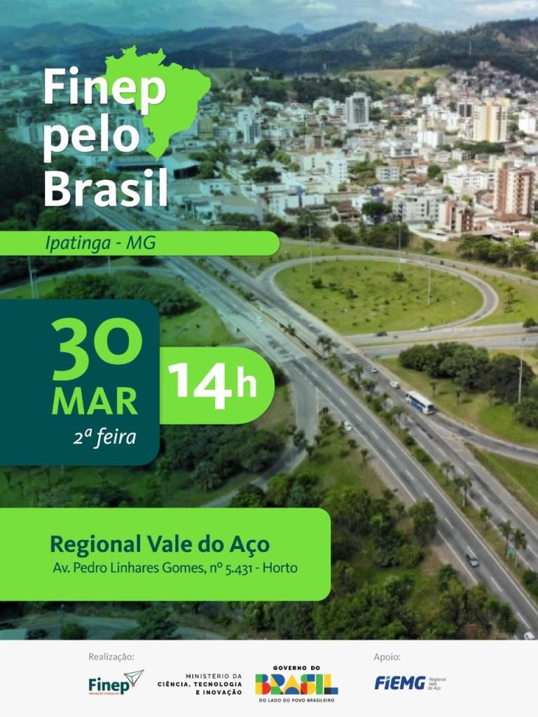 O Vale do Aço receberá dia 30 de março o Finep pelo Brasil”, iniciativa da Financiadora de Estudos e Projetos (Finep), órgão do Ministério da Ciência, Tecnologia e Inovação, que percorre diferentes regiões do país para ampliar o acesso de empresas e instituições às linhas de financiamento voltadas à inovação.A programação terá início às 14h, no auditório da Federação das Indústrias de Minas Gerais (Fiemg), em Ipatinga no antigo Centro de Treinanamento da Usiminas. As inscrições são gratuitas e podem ser feitas pelo Sympla, por meio deste link.
