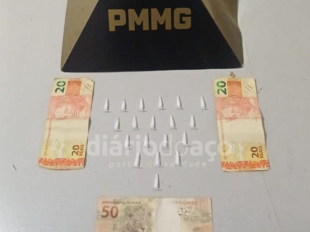 No trajeto, os policiais localizaram uma sacola contendo 19 pinos com cocaína, além de R$ 90 em dinheiro. O material foi apreendido pela equipe da Polícia Militar.
