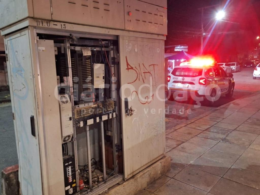 Os policiais militares conseguiram encontrar a dupla que arrombou este armário de telefonia e internet