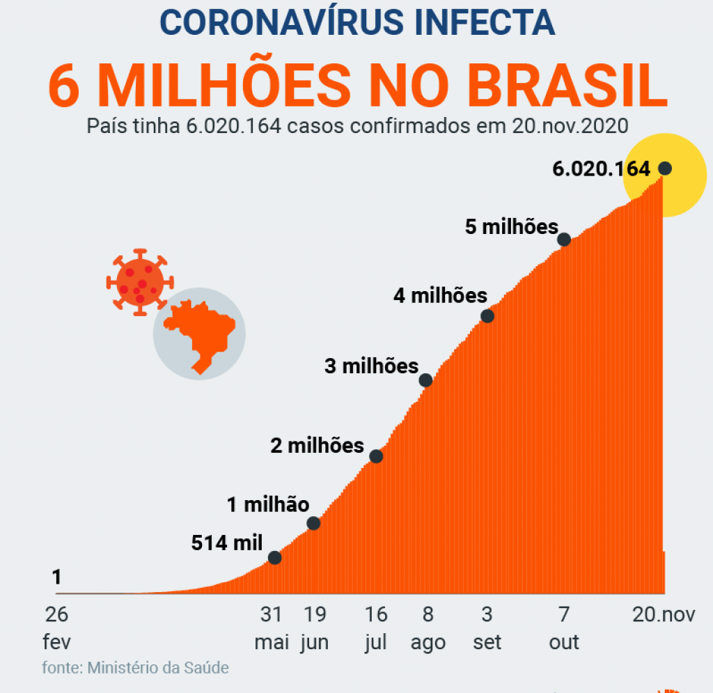 Jonas Valente Repórter Agência BrasilO número de casos de covid-19 no Brasil passa de 6 milhões, Nas últimas 24 horas, foram registrados 38.397 novos casos da doença, totalizando 6.020.164. Ontem (19), o sistema marcava 5.981.767 casos acumulados.