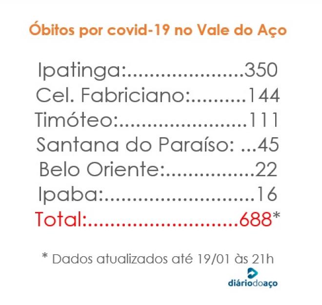 De acordo com os boletins epidemiológicos diários divulgados pelas administrações municipais do Vale do Aço, nesta terça-feira (19) foram registrados cinco óbitos. Os números foram divulgados no mesmo dia em que a região iniciou a vacinação contra a covid-19.