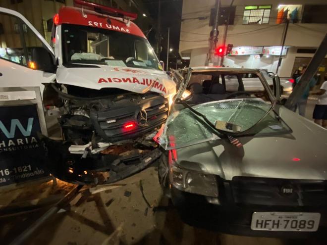 Um homem saiu com ferimentos variados e precisou ser atendido pelo SAMU, em um acidente que envolveu o carro que a vítima conduzia, um Fiat Uno e uma ambulância do SAMU