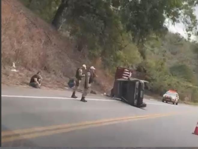 Um veículo com uma carretinha acoplada tombou na BR-458, próximo ao trevo de Ipaba