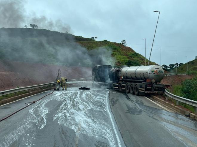 Um caminhão tanque pegou fogo na BR-381 na altura do km 382, em São Gonçalo do Rio Abaixo, sentido João Monlevade