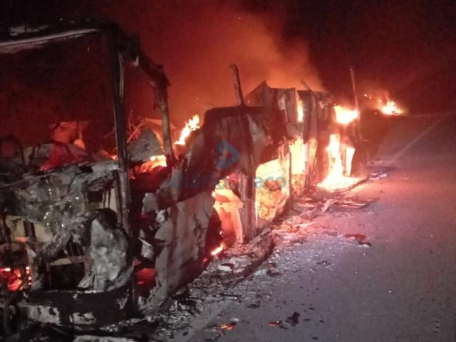 Um ônibus motorhome de uma família circense foi destruído por um incêndio no fim da noite de terça-feira (5) na BR-458, próximo a Iapu