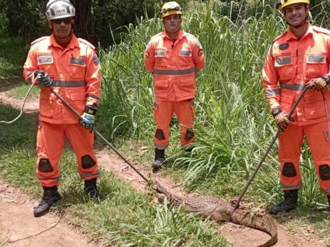 Um jacaré de aproximadamente dois metros, foi capturado em uma área rural do bairro Caladinho de Cima, em Coronel Fabriciano