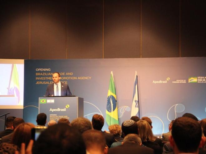 O deputado federal Eduardo Bolsonaro, filho do presidente Jair Bolsonaro, esteve no evento