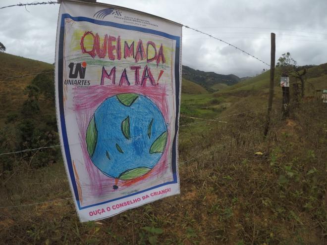 Uma campanha educativa contra queimadas tem chamado a atenção de quem visita as áreas rurais de Ipatinga, cartazes com desenhos dos estudantes da Escola Municipal Mário Casassanta, localizada na comunidade de Ipaneminha, faz o apelo Queimada mata!, ouça o conselho da criança”