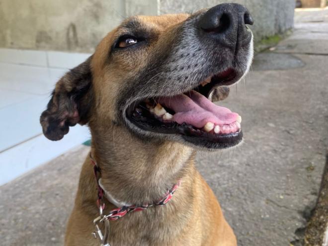 Os moradores do distrito de Barra Alegre, em Ipatinga, tentam conseguir um tutor para uma cachorra fêmea sem raça definida que também “mora” na praça da localidade