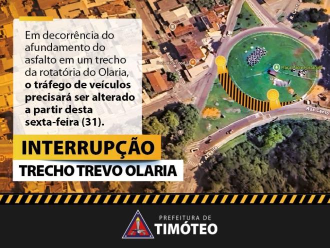 Em decorrência do afundamento do asfalto em um trecho da rotatória do bairro Olaria, em Timóteo, o tráfego de veículos precisará ser alterado a partir desta sexta-feira (31)