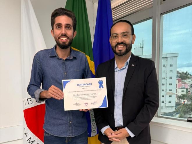 O prefeito ipatinguense Gustavo Nunes (PL) recebeu, nesta terça-feira (5), no gabinete da prefeitura, o certificado de Honra ao Mérito” concedido pela Câmara Minas Gerais-Israel de Comércio e Indústria (CMGI)