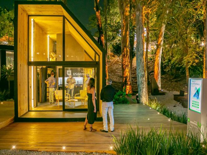 Cabana de aço modular, desenvolvida em parceria com a empresa Liga Arquitetura, é destaque no evento em BH