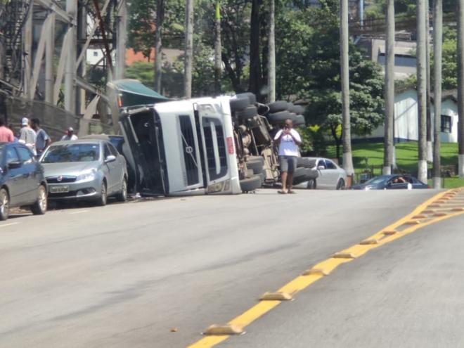 Um caminhão que puxava uma carreta pela área urbana de João Monlevade tombou sobre vários veículos, na manhã dessa segunda-feira (13)