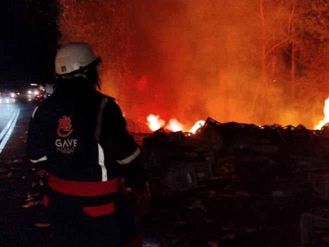 Condutor conseguiu pular da cabine antes que veículo e carga tombassem à margem da rodovia em Nova Era. Veja vídeo do local do acidente.