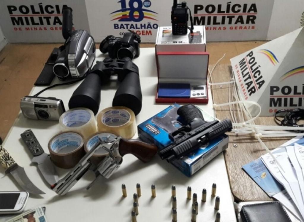 Junto com os suspeitos foram encontradas armas brancas e de fogo, além de fitas adesivas, balança de precisão e outros objetos