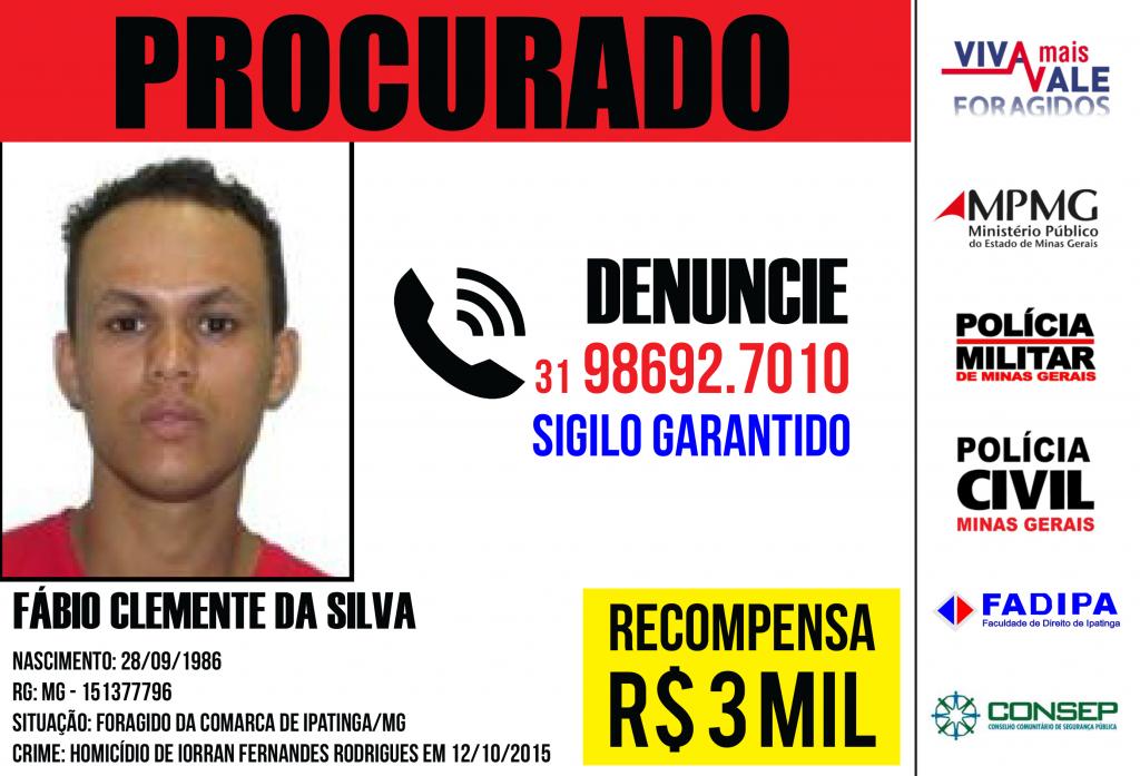 Acusado da morte de Iorran Fernandes Rodrigues, de 16 anos, o foragido Fábio Clemente da Silva, de 30 anos, é procurado pelo programa Viva Mais Vale. E será paga uma recompensa de R$ 3 mil para quem tiver informações que levem a polícia à localização e prisão do denunciado. Quem souber do paradeiro dele ligar para a central do programa, no número (31) 98692-7010.O crime pelo qual Fábio Clemente da Silva é procurado ocorreu em 12 de outubro de 2015. Iorran foi assassinado na rua Piaui, bairro Chácaras Oliveira, em Ipatinga. Desde então, o autor está foragido.