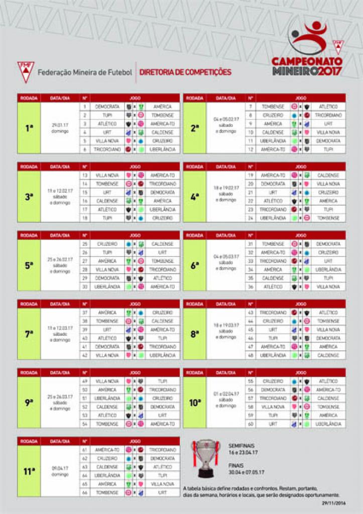 A Federação Mineira de Futebol (FMF) divulgou, nessa terça-feira, 29, a tabela básica do Campeonato Mineiro de 2017. Depois de destacar que o clima não era o ideal para assuntos relativos ao esporte, em razão da tragédia que vitimou 71 pessoas e deixou seis feridos na queda do avião com a delegação da Chapecoense, na Colômbia, a entidade disse que fazia a divulgação para o cumprimento dos prazos do Estatuto do Torcedor.A competição vai começar no último final de semana de janeiro, no sábado 28 e domingo 29. O América, atual campeão, estreia encarando o Democrata, em Governador Valadares. A Pantera foi a campeã do Módulo II do Estadual. O Atlético, vice-campeão na edição deste ano, receberá o América, de Teófilo Otoni, no Independência. O Dragão também subiu de divisão em 2016.