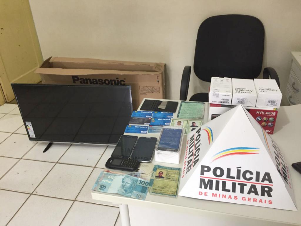 Em poder dos suspeitos presos, foram encontrados documentos e cartões em nomes de outras pessoas, material que era usado para dar o golpe, segundo a polícia. Os policiais recuperaram uma TV de 40 polegadas, um aparelho de som automotivo, celulares, todos esses objetos comprados na Zema Eletro, de Iapu. O carro deles também foi apreendido, um VW Gol, placas HJE-9401.