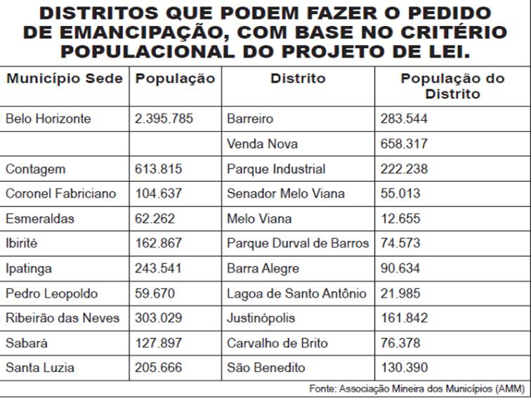 O número mínimo de habitantes exigidos para os distritos reivindicarem a emancipação é de 12.145 moradores. Segundo a Associação Mineira de Municípios, dos atuais 325 distritos mineiros, apenas 11 podem se tornar municípios pelo número mínimo de habitantes.