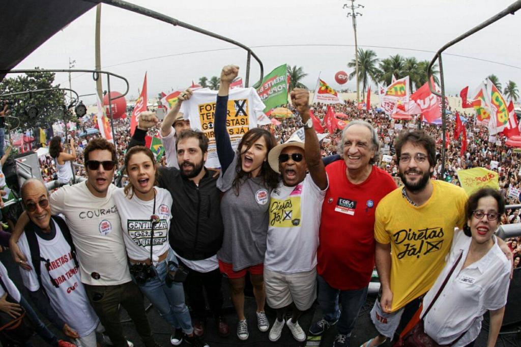 Milhares de pessoas ocuparam, neste domingo, a avenida Atlântica, na altura do posto 3, em Copacabana (zona sul do Rio), na tarde deste domingo (28) em protesto contra o presidente Michel Temer (PMDB) e por eleições diretas para ocupar a presidência.Um público estimado pelos organizadores em cerca de 150 mil pessoas participou do ato. O protesto foi convocado por artistas e organizado pelas frentes Brasil Popular e Povo Sem Medo, iniciativas que reúnem centenas de movimentos populares, centrais sindicais e partidos de esquerda”, divulgou a organização.