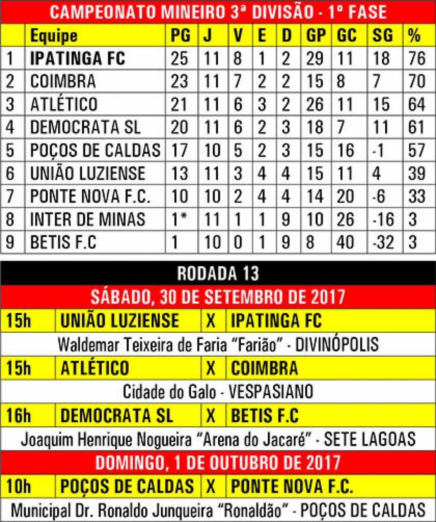 O Ipatinga Futebol Clube realizou, na tarde desta quinta-feira, em seu Centro de Treinamentos, no bairro Cariru, seu último treinamento técnico-tático com vistas ao jogo pela 13ª rodada do Campeonato Mineiro da Terceira Divisão, neste sábado, às 15h, no estádio Waldemar Teixeira de Faria (Farião), em Divinópolis, contra o União Luziense.O técnico Eugênio Souza não comandou atividades intensas após o jogo contra o Inter de Minas (vitória por 3 a 1), em virtude do cansaço dos jogadores, que vão encarar, no espaço de uma semana, três jogos. Foram treinos leves, reforçando o entrosamento, bem como algumas jogadas preparadas para os atacantes e posicionamento da defesa.