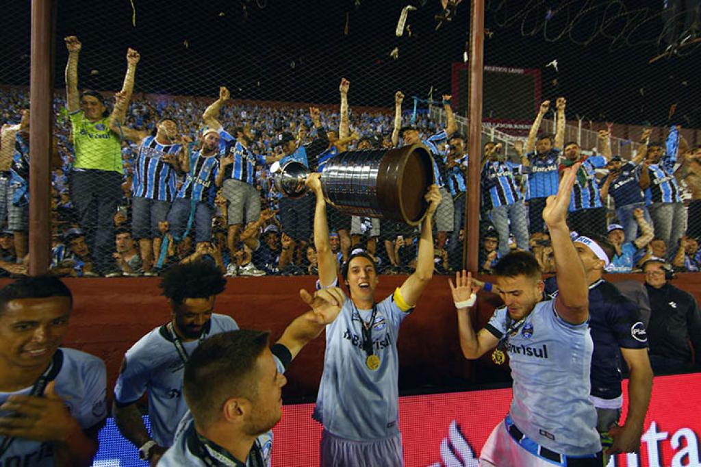 O capitão Geromel ergue a cobiçada taça na festa que superlotou a Arena, em Porto Alegre