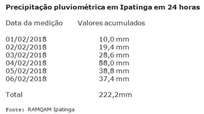 Acumulado da chuva fez transbordar a lagoa do Parque Ipanema, situação que não era vista há alguns anos Em seis dias o acumulado da chuva atingiu 222,2 milímetros em Ipatinga. É o que mostram dados apurados pelo Diário do Aço junto a Estação da Rede Automática de Monitoramento da Qualidade do Ar e Meteorologia (RAMQAM) de Ipatinga localizada no bairro Cariru. O dia 4 de fevereiro, domingo, registrou o recorde de 88 mm, conforme os dados técnicos. Já nas 24 horas de terça-feira o acumulado chegou a 37,4 mm.