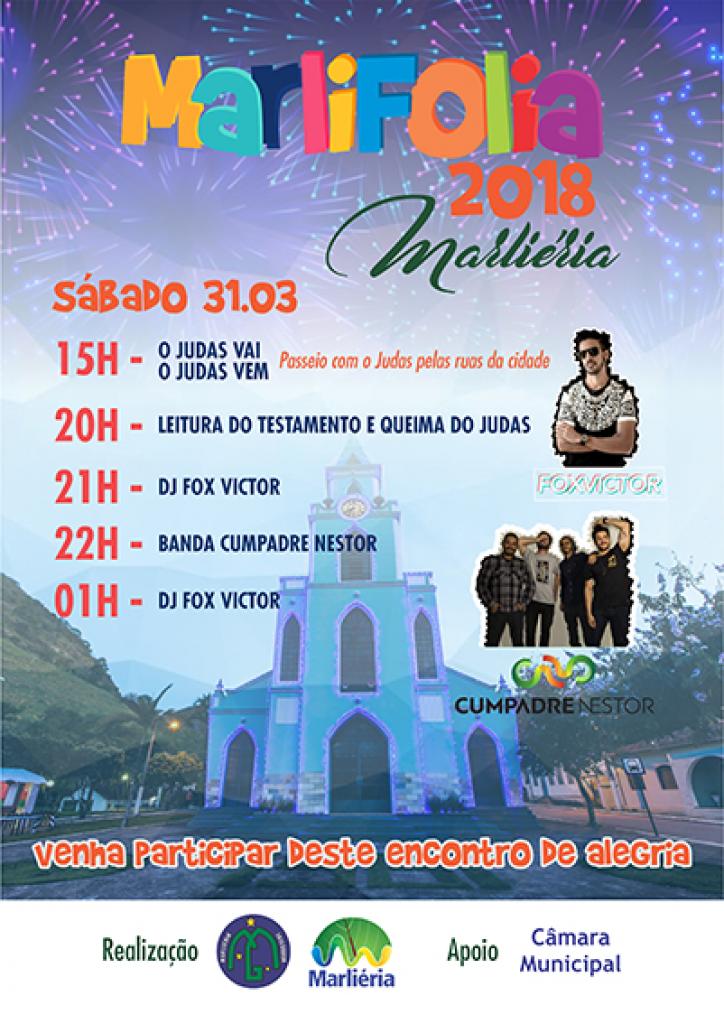 A Semana Santa em Marliéria está cheia de oportunidades para quem gosta de festa alegre e gente bonita. No sábado (31), a cidade de Marliéria vai oferece uma programação repleta de cultura e alegria, com o MarliFolia 2018. Pelo 35º ano consecutivo acontece a festa de malhação do Judas.É uma grande festa, irreverente e alegre. A partir de 15h é realizado um desfile pelas ruas da cidade, com o boneco do Judas” em uma charrete. Acompanhando o desfile, centenas de pessoas, de todas as idades, cantando versos populares em referência ao Judas.