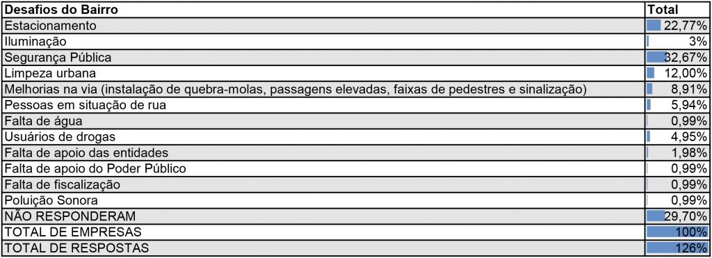 Durante as visitas, foi realizada pesquisa qualiquantitativa para identificar as demandas de cada empresário e os problemas da região. Foram feitas duas perguntas: 1 - Enquanto Empresário, quais são os seus maiores desafios? 2 - E no bairro, quais são os maiores problemas?