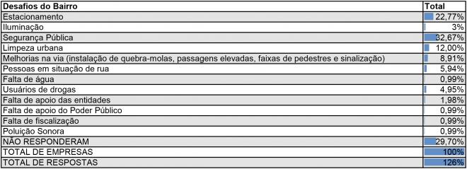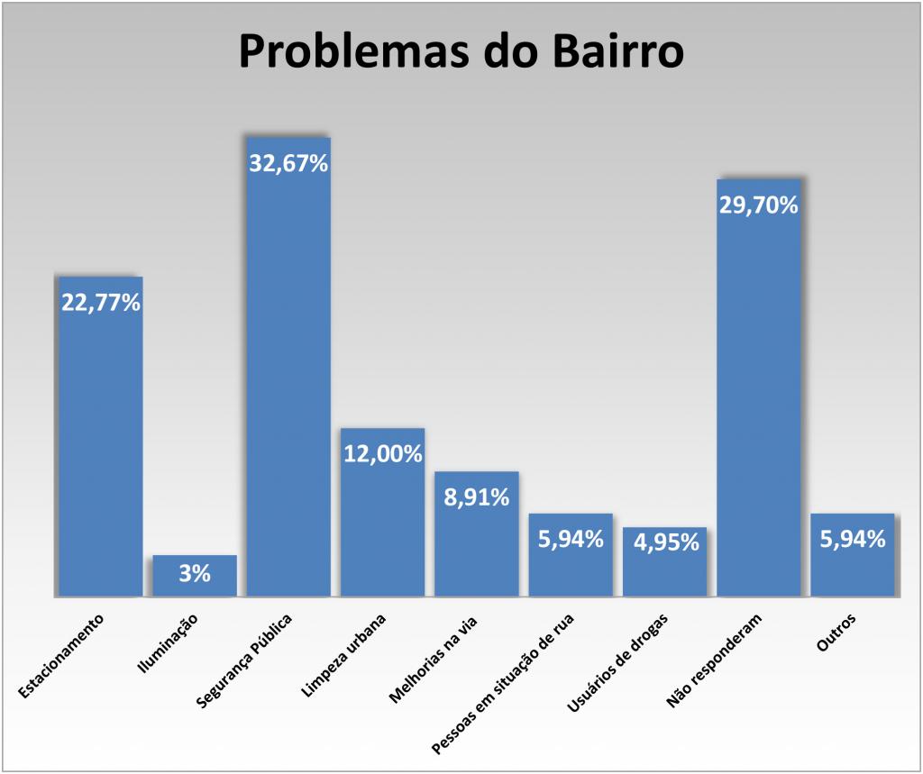 Outros dois problemas relatados pelos proprietários participantes da pesquisa, foram: falhas na segurança pública e a falta de estacionamento. A reclamação sobre o estacionamento é proveniente, sobretudo, de empresários com estabelecimentos na avenida Fernando de Noronha, principal via do bairro, e na rua Bárbara Heliodora.