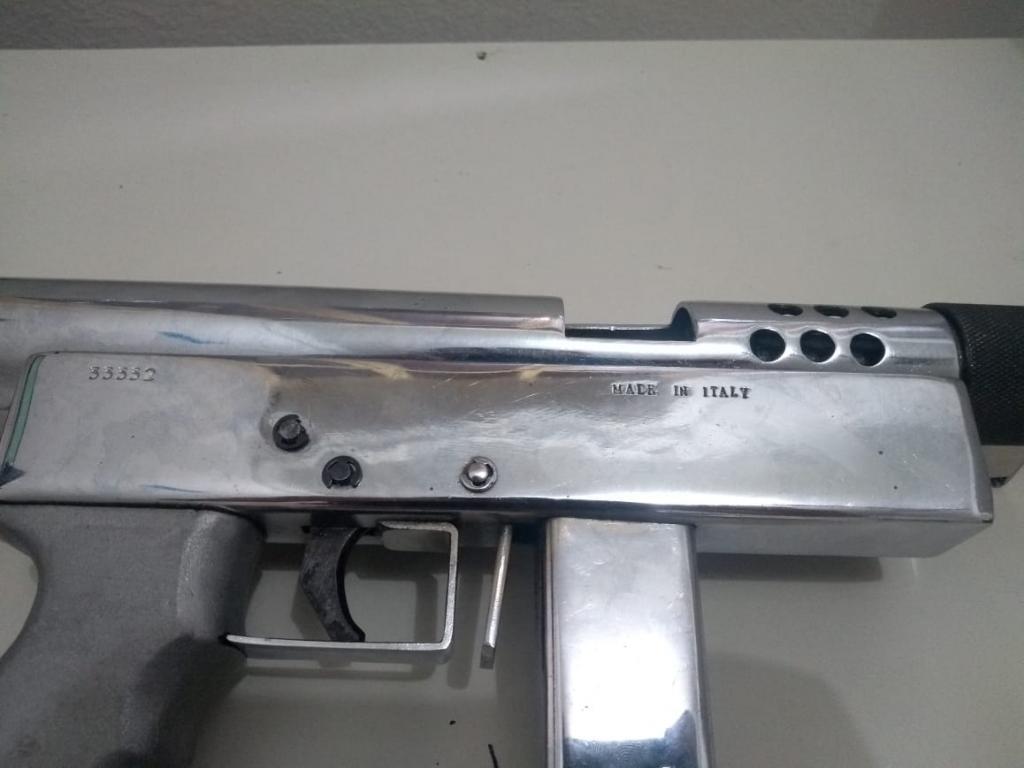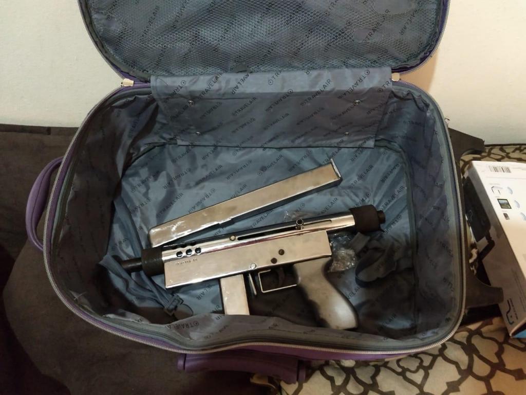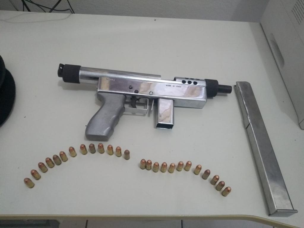 Em uma mala, colocada atrás de uma cortina, os policiais localizaram uma submetralhadora com a inscrição "Beretta .40". Trata-se de uma marca de fábrica de armas italiana, mas a submetralhadora aparenta ter fabricação artesanal. Além disso, foram apreendidos 25 cartuchos do mesmo calibre. Armas de calibre .40 são de uso exclusivo das forças policiais no Brasil.