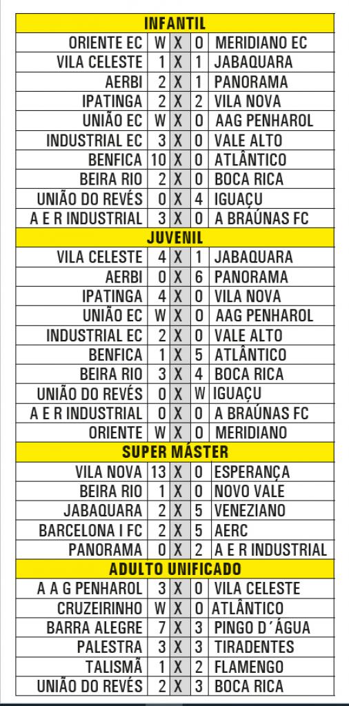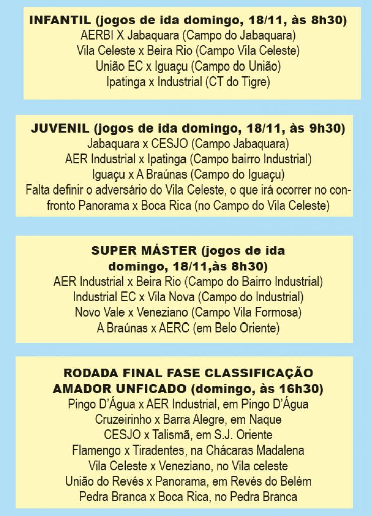 Com os jogos realizados na manhã do feriado de 15 de novembro (infantil, juvenil e supermáster), os três campeonatos organizados pela Liga de Desportos de Ipatinga (LDI) definiram os times classificados à fase quarta de final, que começam já neste fim de semana. Os resultados foram: