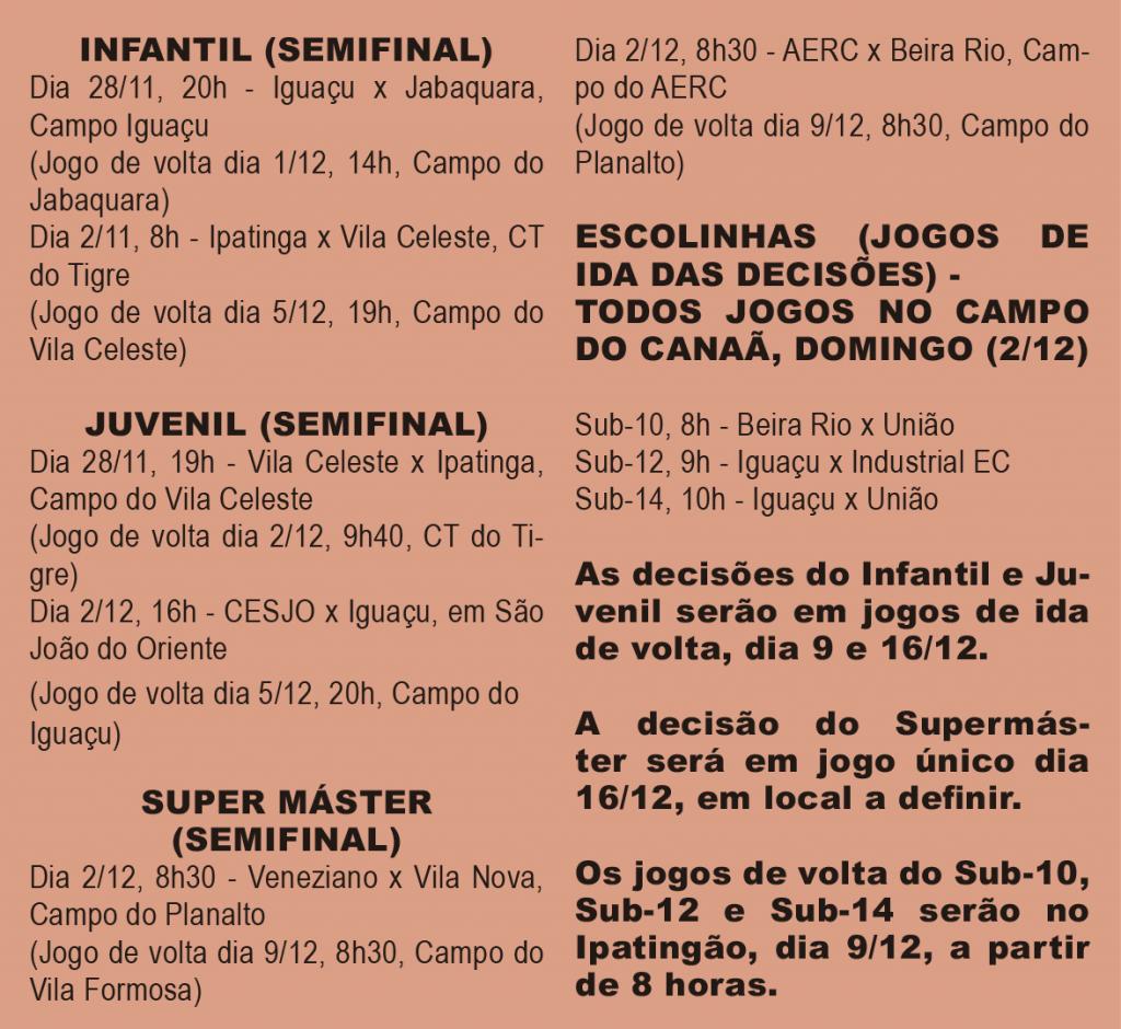 A presidência e a diretoria técnica da Liga de Desportos de Ipatinga (LDI) confirmaram na tarde desta terça-feira (27) o calendário dos jogos decisivos dos campeonatos das categorias infantil, juvenil, supermáster, sub-10, sub-12 e sub-14. A série de jogos decisivos começa já na noite desta quarta-feira (28).