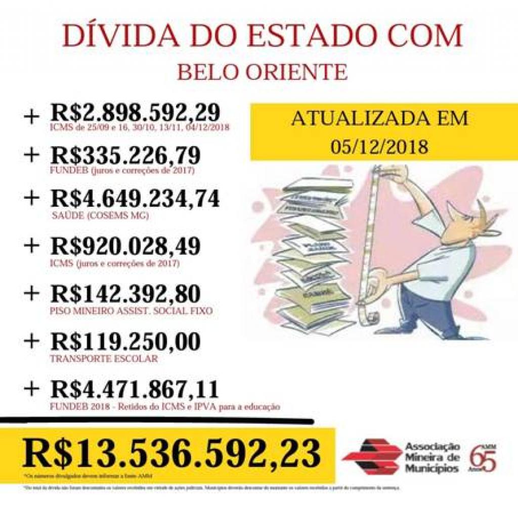 O secretário lembrou ainda que a prefeitura tomou todas as providências para receber os recursos que estão sendo confiscados pelo estado. Nem uma liminar alcançada na Justiça fez com que recebêssemos. É impossível manter esse cenário. Torcemos para que isso volte à normalidade com o novo governo, porque está insustentável essa situação”, frisou Vicente Júnior, adiantando que a preocupação agora é assegurar o pagamento de dezembro. Segundo levantamento recente da Associação Mineira de Municípios, a dívida do estado com Belo Oriente já ultrapassa os R$ 13,5 milhões. Confira no gráfico.