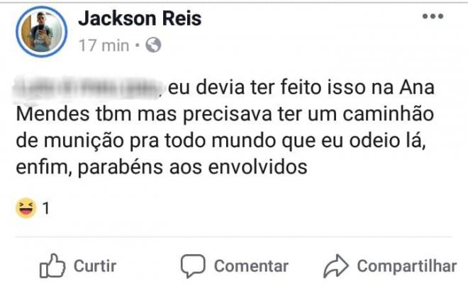 O usuário que se identifica como Jackson Reis, manifestou acerca do massacre na Escola Estadual Raul Brasil da cidade de Suzano, interior de São Paulo e expressou a intenção de produzir fato semelhante na Escola Estadual Ana Mendes, no distrito de São Pedro do Avaí, município de Manhuaçu, na Zona da Mata mineira.