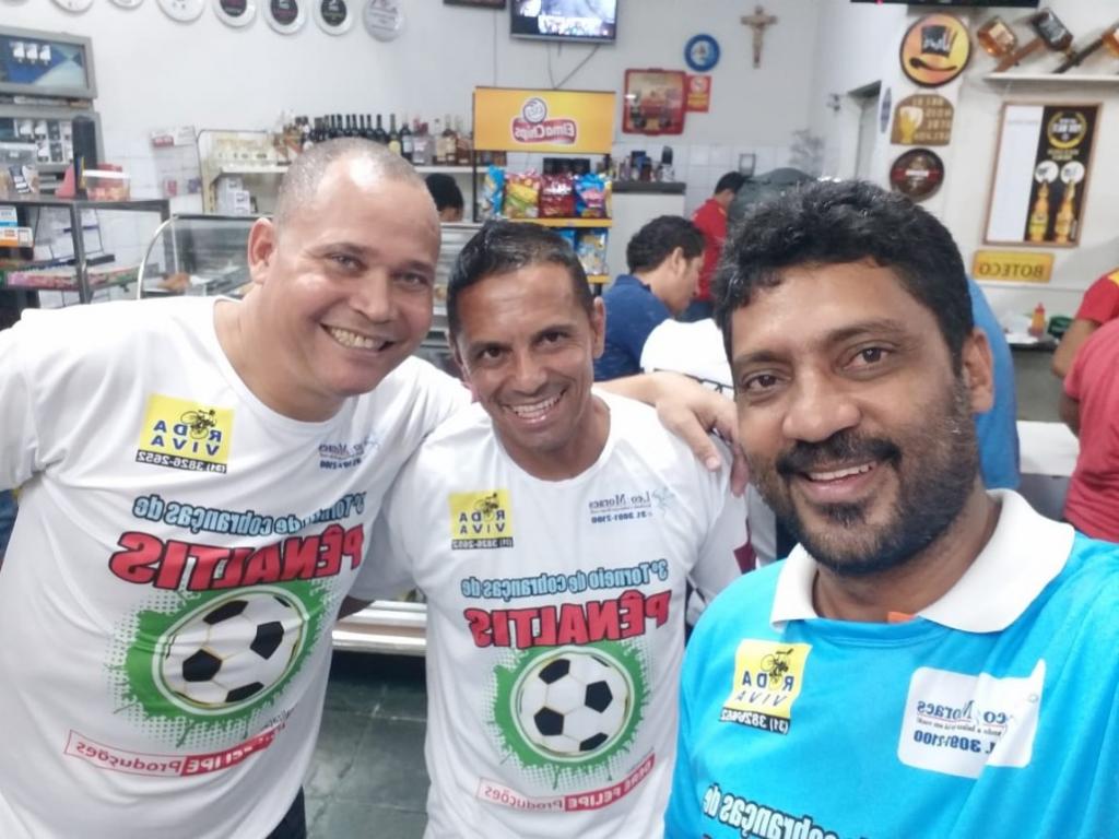 Uma das duplas que irá cobrar os pênaltis, Armando e Robinho, com o organizador do torneio, Deré Felipe