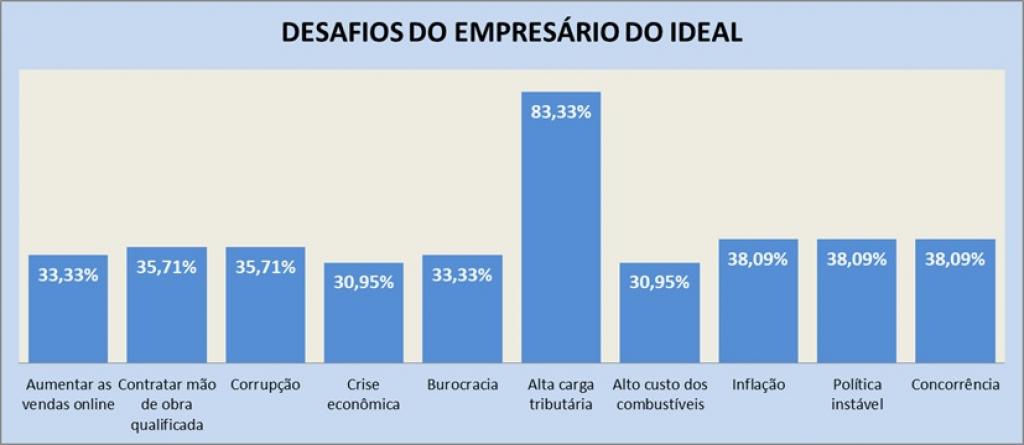 O principal desafio enfrentado pelo empresário no Ideal, indicado na pesquisa, foi a alta carga tributária, 83,33% dos empresários entrevistados apontaram os impostos exacerbados como um dos principais entraves para o empreendedorismo. Outros desafios indicados foram: inflação, política instável e concorrência, todos com o índice de 38,09%.