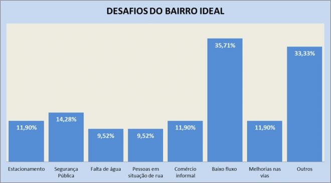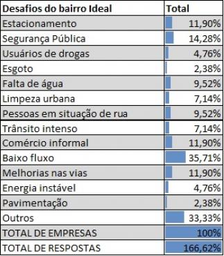 Em relação ao bairro, os dois problemas relatados pelos proprietários participantes da pesquisa foram: baixo fluxo de pessoas, que apareceu em 35,71% das respostas, e falhas na segurança pública, que teve um índice 14,28%.