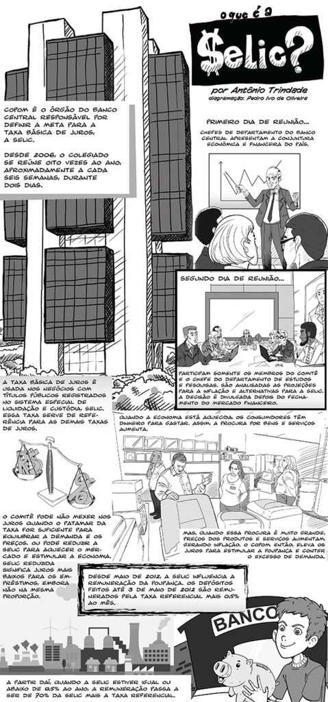 A taxa básica de juros é usada nas negociações de títulos públicos no Sistema Especial de Liquidação e Custódia (Selic) e serve de referência para as demais taxas de juros da economia. Ao reajustá-la para cima, o Banco Central segura o excesso de demanda que pressiona os preços, porque juros mais altos encarecem o crédito e estimulam a poupança. Ao reduzir os juros básicos, o Copom barateia o crédito e incentiva a produção e o consumo, mas enfraquece o controle da inflação. Para cortar a Selic, a autoridade monetária precisa estar segura de que os preços estão sob controle e não correm risco de subir. (Wellton Máximo Repórter da Agência Brasil)