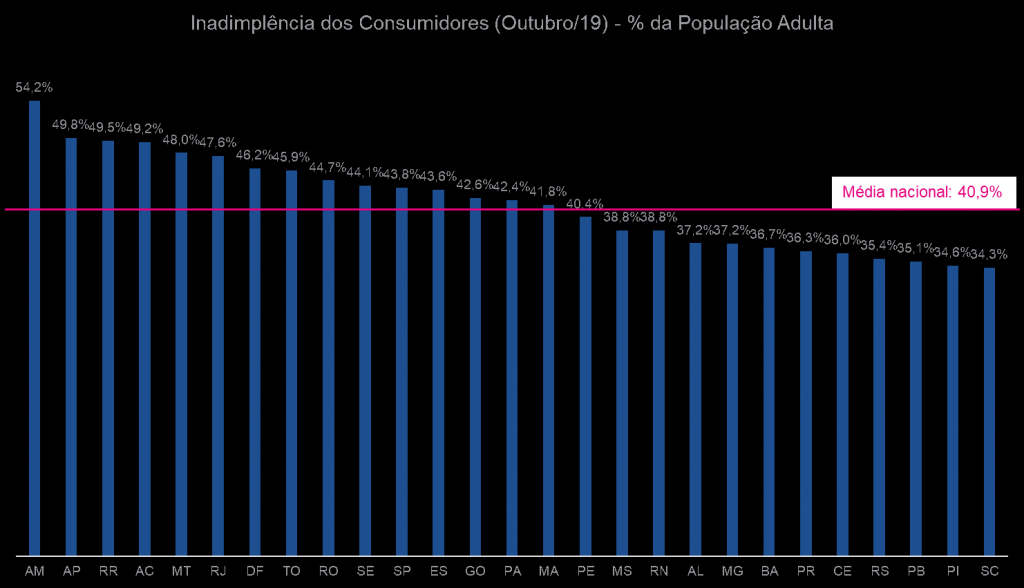 O Amazonas é o estado com maior porcentagem da população com contas atrasadas, o único acima de 50% 54,2%. Amapá e Roraima aparecem na sequência, fazendo com que todos os estados da região Norte tenham inadimplência acima da média nacional, que é de 40,9%.