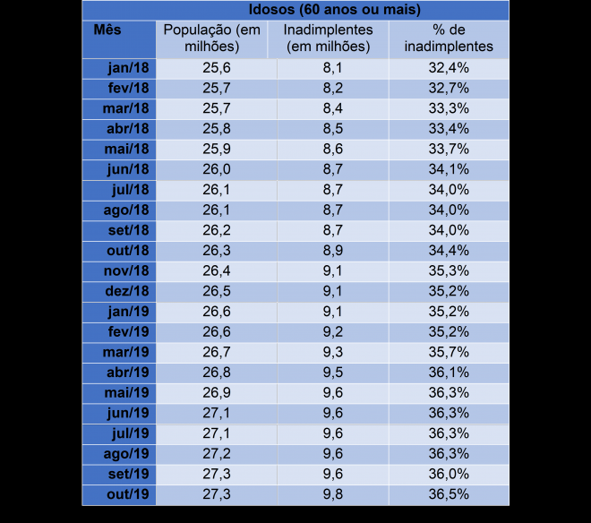 Entre todas as faixas etárias, a inadimplência das pessoas com mais de 60 anos foi a que mais cresceu em 2019. De outubro de 2018 a outubro de deste ano, 900 mil novos idosos deixaram de pagar suas contas, ou seja, um aumento de 10,1% no período, atingindo 9,8 milhões de inadimplentes. Confira na tabela.A alta do índice geral neste mesmo intervalo foi de 3,4%. Em outubro deste ano, havia 63,9 milhões de consumidores com as contas atrasadas e não pagas, representando 40,9% da população adulta. Os números de uma pesquisa da Serasa Experian.