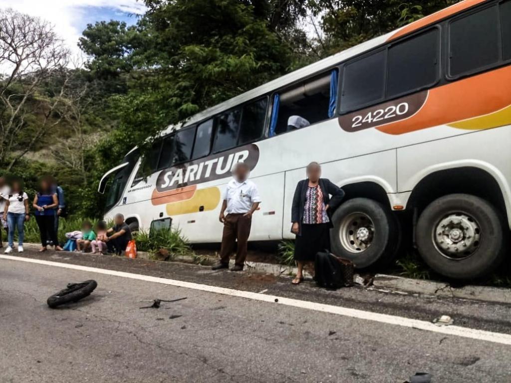 Com o impacto, e na tentativa do motorista em evitar o acidente, o ônibus foi jogado para fora da pista, parando num matagal ao lado da rodovia.