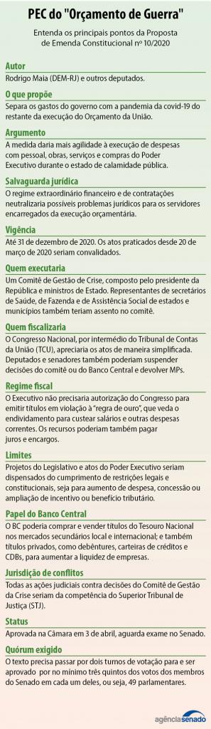 A Proposta de Emenda à Constituição (PEC) 10/2020 está na pauta desta segunda-feira (13)Aprovada sem muita dificuldade pela Câmara dos Deputados na semana passada, a chamada PEC do "Orçamento de Guerra" deve ser alvo de um longo debate no Senado. Além de apontar questões que precisam ser alteradas ou mais bem discutidas, alguns parlamentares questionam até mesmo a necessidade de alterar a Constituição para o enfrentamento da pandemia de coronavírus.