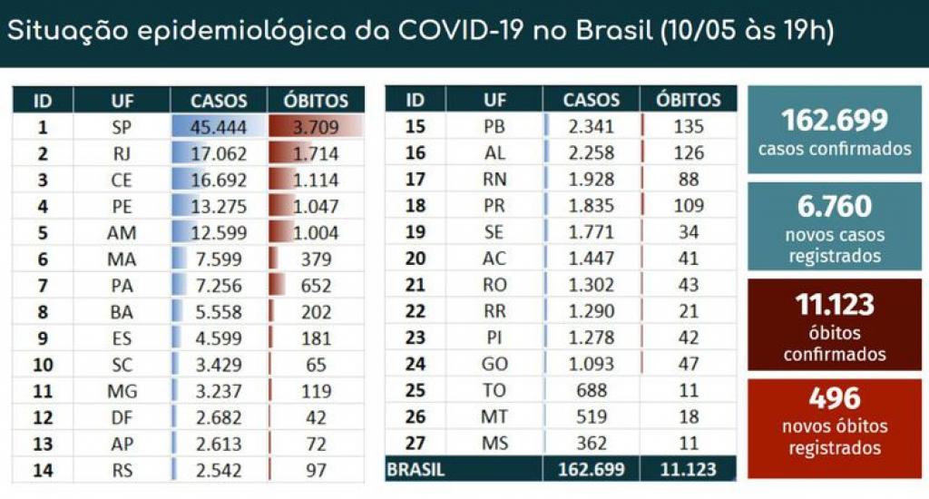Marcelo Brandão - Repórter da Agência BrasilO Brasil chegou a 11.123 mortes por covid-19 neste domingo (10). Segundo dados do Ministério da Saúde divulgados no início da noite, são 162.699 casos confirmados, sendo 6.760 registrados nas últimas 24 horas. O número de mortes registrado no mesmo período foi de 496.